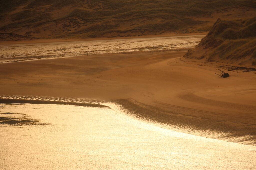 Unceremoniously one of our group had hung his wetsuit on the sign as he got ready in his camper, parked right next to it and paying no heed to the rules. I had just got my camera out to take a photo of what I thought was quite an amusing scene- this officious sign, decorated with stickers and now a wetsuit. It loomed in front of what was one of the most beautiful landscapes I’d ever seen. A huge expanse of golden light on a river..sand merging into sky and sea. The surfer looked at me quizzically and whipped away his wetsuit before I could take the picture. He muttered something like ‘Are you getting some good pictures there?’ Obviously very confused about my subject matter.